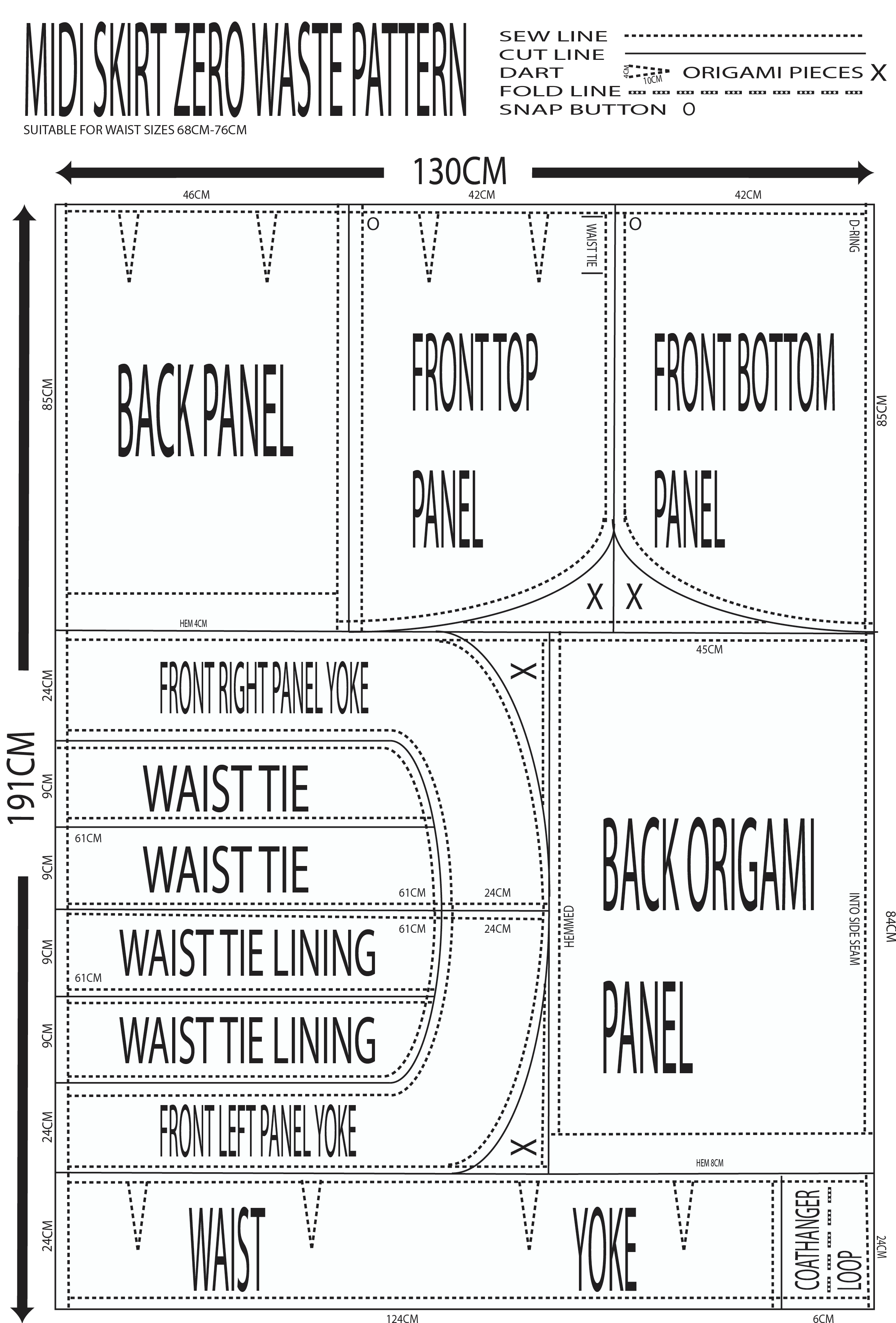 The role of a pattern maker is to continually innovate and conceptualize more effective and efficient patterns for fashion garments. Taking elements of zero waste pattern cutting in the historical and contemporary contexts, the following midi skirt and it’s zero waste pattern was created. The pattern is available for download and can be altered easily to suit most fabric widths.